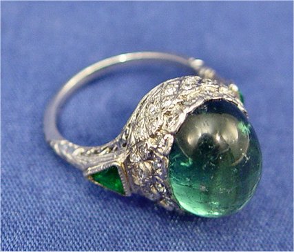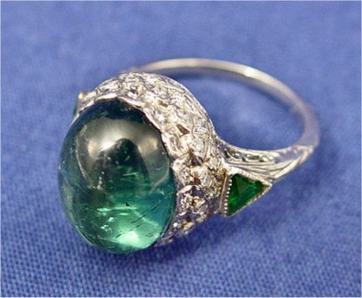 9CT TOURMALINE PLATINUM DIAMOND RING: Antique platinum mounting encrusted with diamonds and bezel set with two trillion cut tsavorites supports this magnificent 9ct cabochon green tourmaline. Size 5.75, 5.8 grams. Est. $1100/1400**