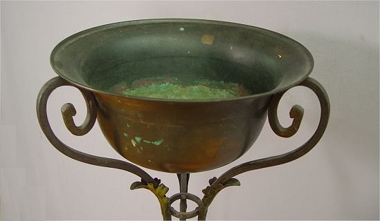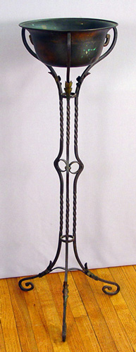 EARLY 20TH C WROUGHT IRON JARDINIERE AND STAND: Original metal jardiniere sits in a wrought iron stand. 44 1/2''h. , the pot is 13'' dia.