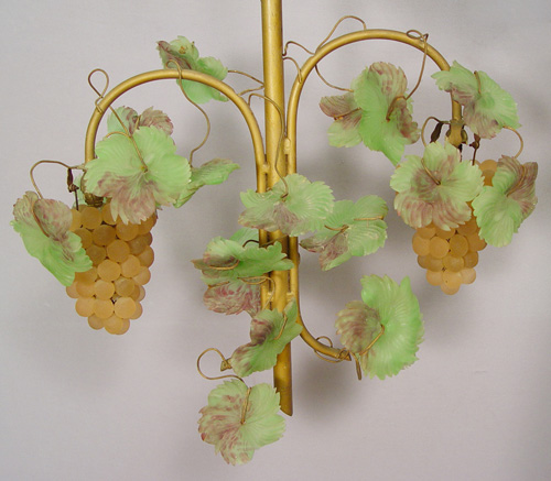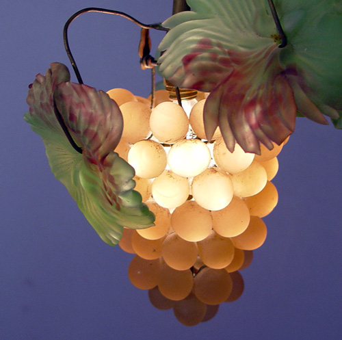 CZECH SATIN GLASS GRAPE CHANDELIER: Two bunches of pink grapes with green leaves. 19''h. 20''w.