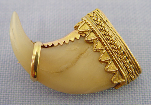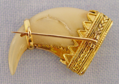 ANTIQUE TIGER CLAW PIN: 18k yellow gold frame with straight bar pin and c clasp, this claw purported to be from a tiger. No mark found, gold karat acid tested, 1 5/8'' with pin part level. Est. $600/800**