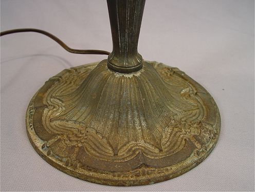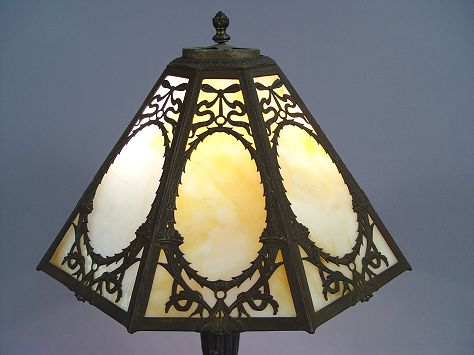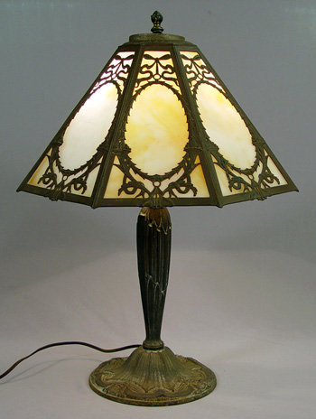 VINTAGE SLAG GLASS TABLE LAMP: 8 panels of caramel slag glass, iron base, 2 pull chain sockets. There are co cracks in the glass, the finish on the base is worn. 22''h, shade is 15'' dia.