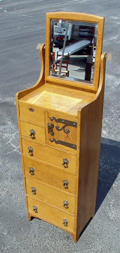 GOLDEN OAK ARTS & CRAFTS LINGERIE CHEST: Unusually narrow chest of four full length drawers under a hat box and two half length drawers. Beveled mirror, all original hardware. 65''h. overall, x 19''w. x 20''.Without the mirror the chest is 45''h.