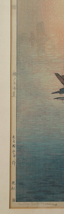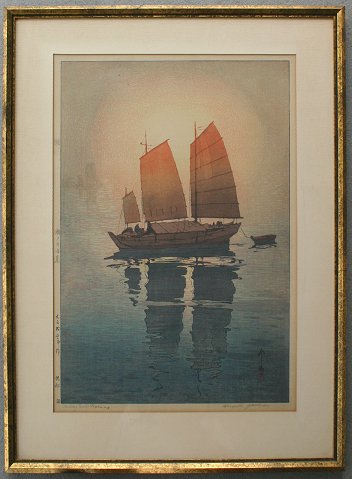 HIROSHI YOSHIDA DOUBLE OBAN WOODBLOCK: Sailing Boats Morning, sight size 20 3/4'' x 14 3/4'', pencil titled, stamped signature, chop marks in left margin, fine frame, 27'' x 21''. Est. $400/600**