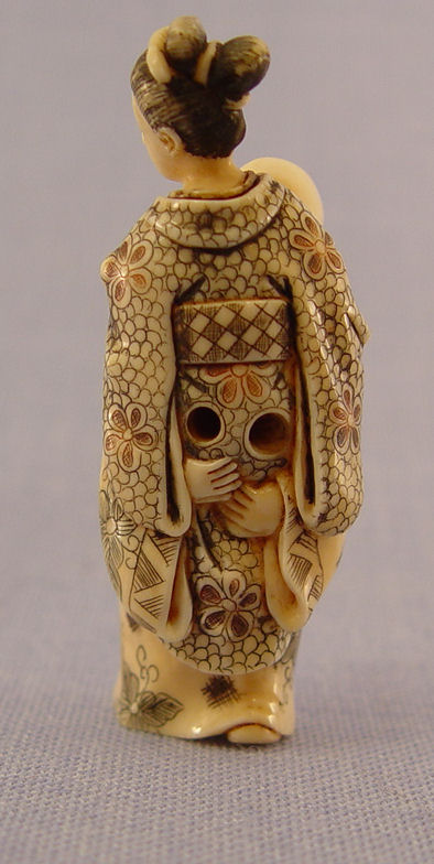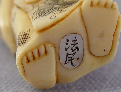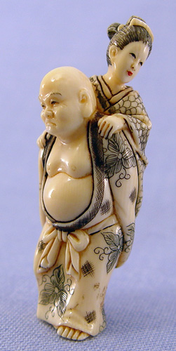 JAPANESE CARVED IVORY NETSUKE: Buddha carrying a woman on his back, inlay mother of pearl bears the signature. 2 3/4''h.