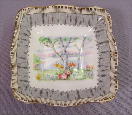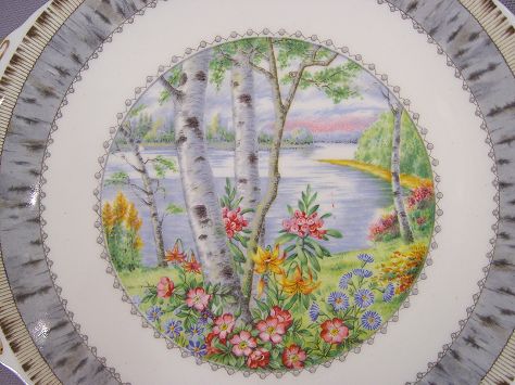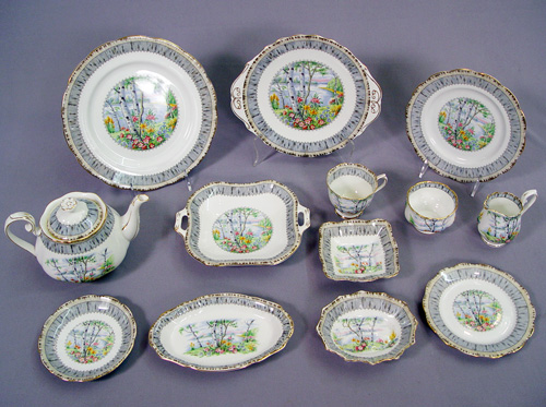ROYAL ALBERT SILVER BIRCH CHINA SERVICE: To include teapot, creamer, open sugar, 9 dinner plates, 8 salad plates, 8 bread plates, 12 cups, 12 saucers, cake serving plate, relish tray, square pierced handle plate, a square and an oval nut dish.