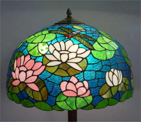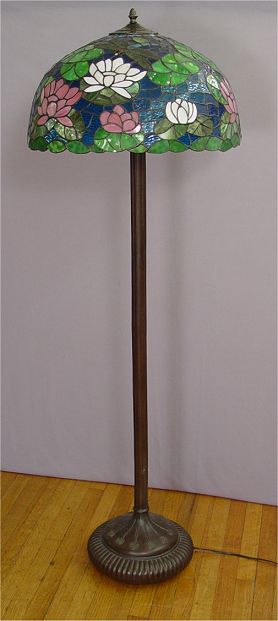 CONTEMPORARY LEADED GLASS FLOOR LAMP: Dragon fly motif leaded glass shade, bronzed base. 64''h., the shade is 24'' dia.