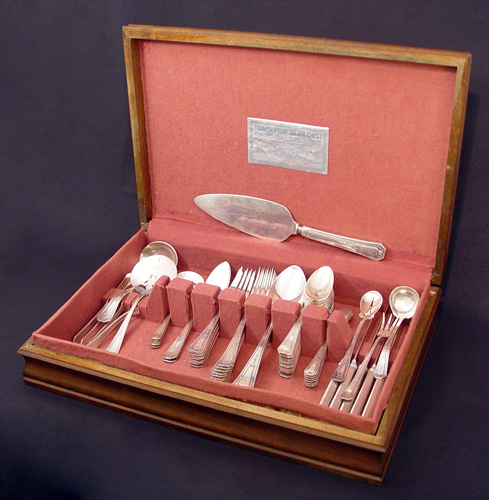 R WALLACE & SONS STERLING FLATWARE SERVICE ''PRINCESS MARY'', 1922: 65 pieces to include, six knives 8 3/4'', nine butter knives 5 5/8'', one master butter 6 3/4'', eight forks 7 1/8'', nine salad forks 6 1/4'', six tablespoons 8 1/4'', ten five o'clock teaspoons 5 7/8'', five teaspoons 6'', cake knife 10'', sugar spoon 6'', large jelly knife 6 3/4'', one large bon bon spoon 6 1/4'' no monogram, three small bon bon spoons 4 3/4'', cream ladle 5 3/16'', gravy ladle 6 1/8'', pickle fork 5 5/8'', and a pierced bowl nut spoon 6''. All monogrammed Y unless noted above, sold as a lot in a wooden silver chest.