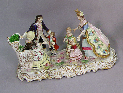 VOLKSTEDT GERMANY FINE PORCELAIN FIGURAL GROUP: Six figures depicting a visit to grandmother. 8''h. x 12''l x 6'' Please note old repair. Bears the mark for Muller & Co., Volkstedt.