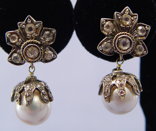 GEORGIAN STYLE DIAMOND AND PEARL DANGLE EARRINGS: Sterling and 14k yellow gold Georgian style mountings encrusted with rose cut diamonds and supporting a 10mm white pearl, post findings with large back, approx. 1 1/8''l., 9.2 grams. Est. $750/1000**