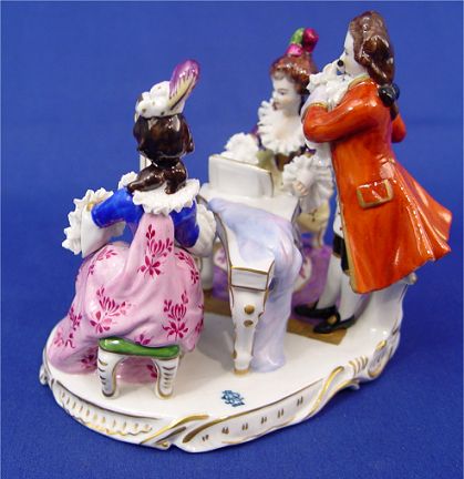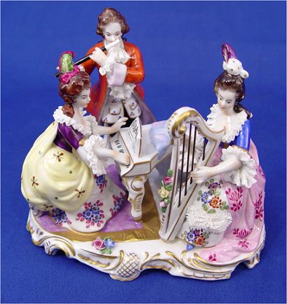 DRESDEN PORCELAIN MUSICAL FIGURAL GROUP: Three figures with harpsichord, flute and harp. 6'' x 4 1/2'' x 5''