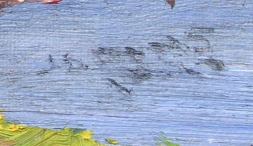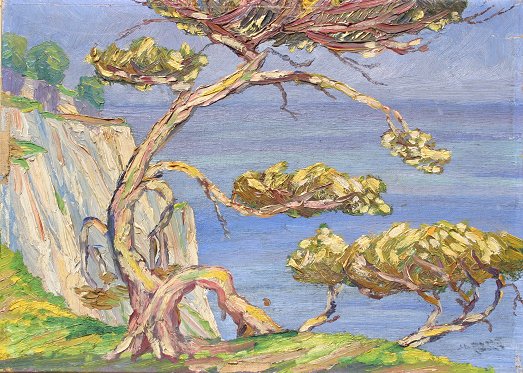 CARMEL COASTAL O/B ILLEGIBLY SIGNED: 10'' x 14'', unframed, circa 1940. Several abrasions, spot of fleck.