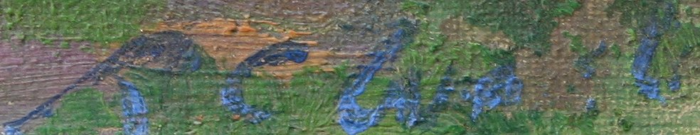 IMPRESSIONIST OIL/BOARD LANDSCAPE: 13 1/4'' x 10'', Signed lower right RC We?, carved gilt frame with wear, 19'' x 16''. Needs cleaning, some warping to cardboard, scattered abrasions.