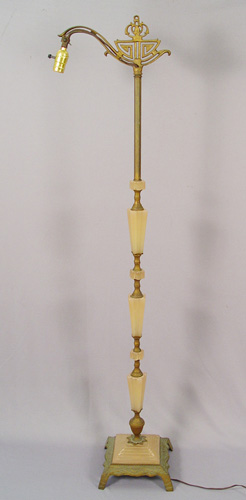 ART DECO ERA FLOOR LAMP WITH PINK GLASS: Bridge type floor lamp with pink glass on the base. 56''h.