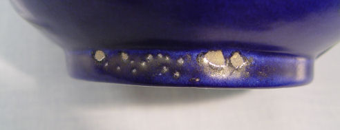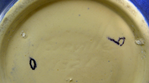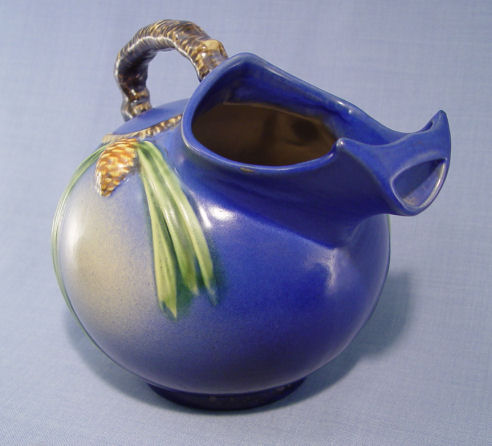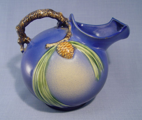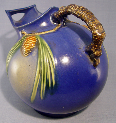 ROSEVILLE BLUE PINECONE BALL PITCHER: Shape 132, measures 8''h. Deep blue, free of chips, cracks, or repairs.