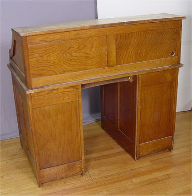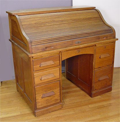TURN OF THE CENTURY S CURVE OAK ROLL TOP DESK: Interior drawers and pigeon holes under the S curve roll. In good working order. 80''h. x 106'' x 18 1/2''. Privacy panel is missing, but available.