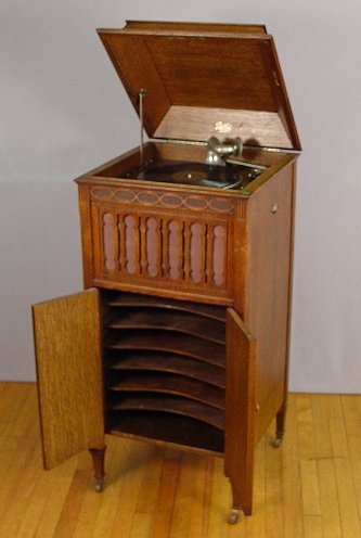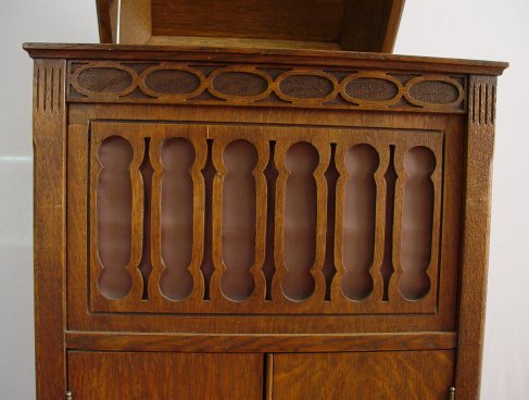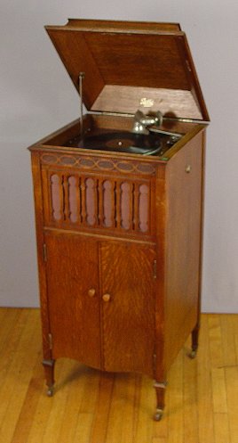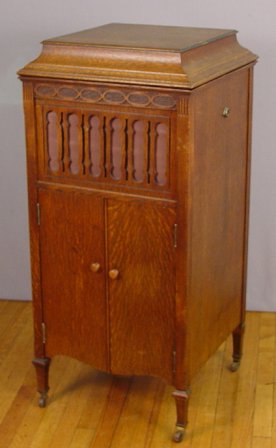 VINTAGE OAK CASE PATHE FLOOR STANDING PHONOGRAPH: In good working order. Crank and needles included. 44''H. x 20 3/4'' x 20 1./2''