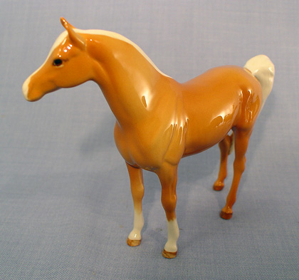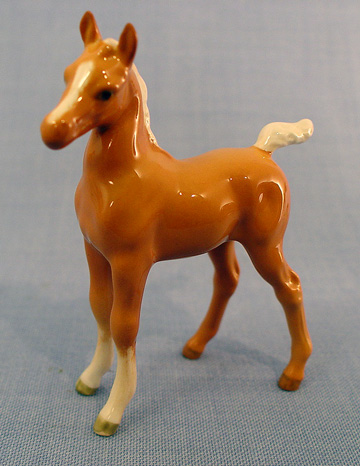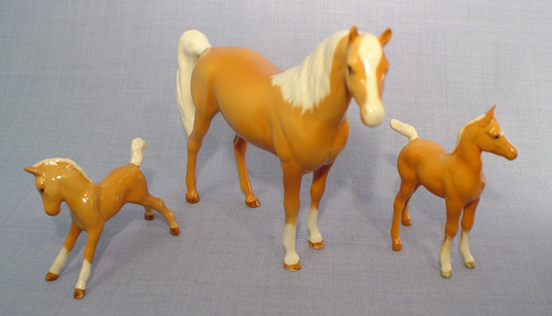 BESWICK MARE AND 2 FOAL HORSE FIGURES: To include 1) Palomino Mare, 6 1/2''h. x 8''l. 2) Arab Foal, model 1407, 4 1/4'' x 3 1/4'', 3) Small foal, stretched and facing right, model 836, 2 3/4''h. x 3 3/4''. Designed by Arthur Gredington.