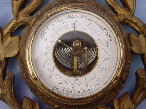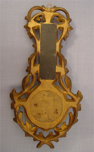 CARVED GILT WOOD THERMOMETER BAROMETER: Carved and gilt wood wall hanging aneroid / holosteric barometer along with a mercury stick thermometer. 15 1/2''h., diameter of barometer is 3'' dia.