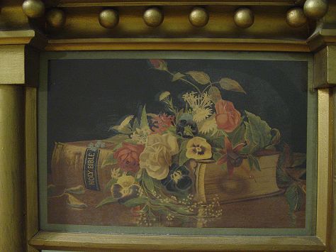 SHERATON STYLE ARCHITECTURAL MIRROR: Rectangular two part mirror with upper section having an image of the bible and a bouquet. Row of decorative balls under the cornice. Gold painted finish. 32'' x 19 1/4''.
