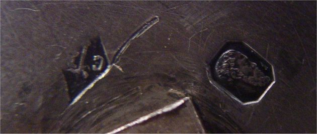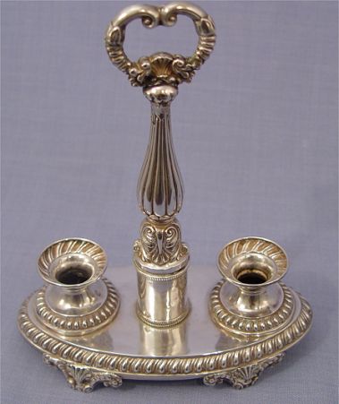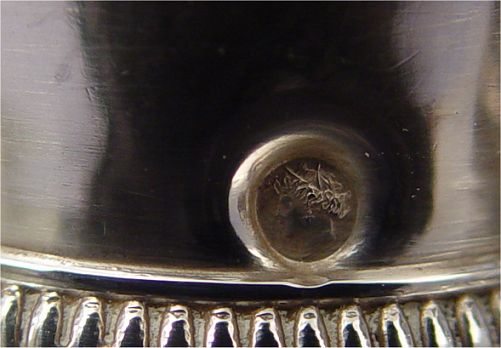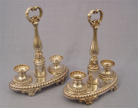 FRENCH STERLING STANDS: Marks indicate Paris 1819-1838 with large guarantee mark, matching stands of unknown purpose, hold two inserts each - possibly glass candle or sauce dishes?. 243 and 250 grams = 15.85 troy oz.