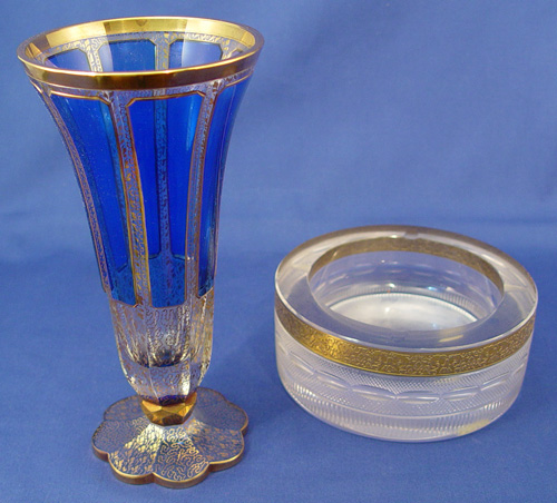SIGNED MOSER GLASS: Gold rimmed ashtray, 6 1/2'' dia. 3 1/2''h., the glass is 3/4'' thick. Signed with paper label and etched ''Moser''. Sold with a blue and gold enameled Bohemian glass vase, 9''h.