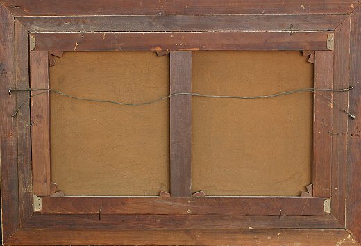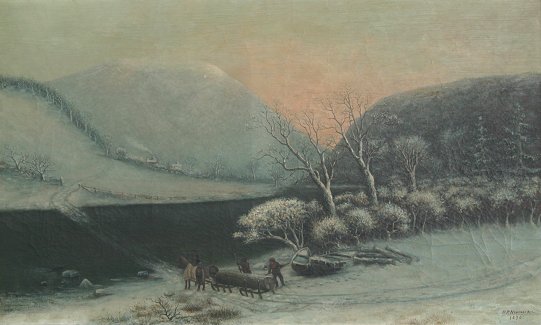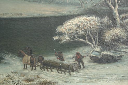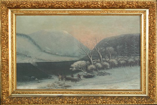 19TH C. WINTER LANDSCAPE SIGNED R.P. NEUMERKER: O/C, Depicts an Attempt to Cross an Icy River by Horses Pulling a Log, 22'' x 36'', signed and dated 1890, super period gilded gesso frame with missing gesso, gold overpaint, 30'' x 44''.