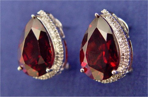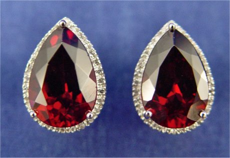 GARNET AND DIAMOND OMEGA BACK EARRINGS: Large pear cut garnets of deep red, measuring approx. 14.5 x 10 x 7mm, prong set in 14k white gold with accenting diamond band, approx. 5/8'', 7 grams. Est. $300/400**