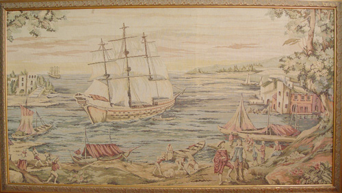 LARGE 6 FT ITALIAN TAPESTRY: Depicting ship at the port coming into the bay. In very good condition, professionally framed and backed. 3'5'' x 6'.