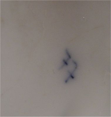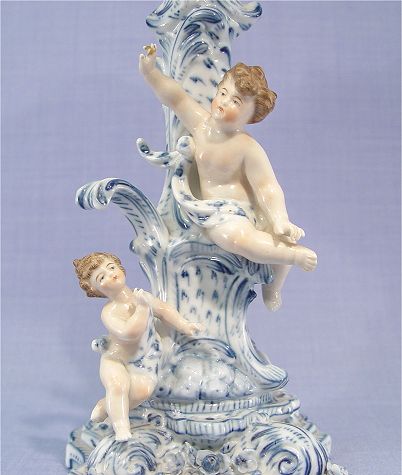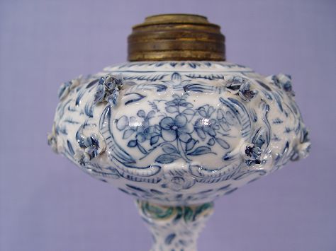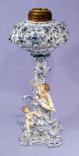 FINE GERMAN PORCELAIN OIL LAMP: Flow blue with applied cherubs, 14''h. Illegible blue mark under glaze.