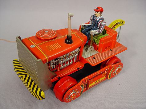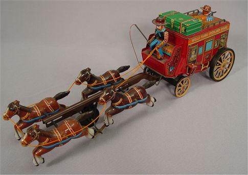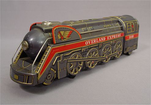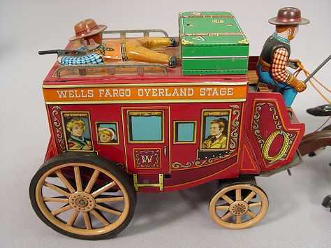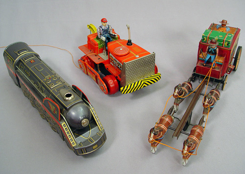 3 VINTAGE TIN TOYS: 1) Alps Wells Fargo Overland stage coach, 6''h. 18 1/4''l. 2) Modern Toys Overland Express Train Engine, 4 3/4''h., 15 1/2''l. 3) Battery operated tow dozer, 6''h., 10'' long. All in very good condition.