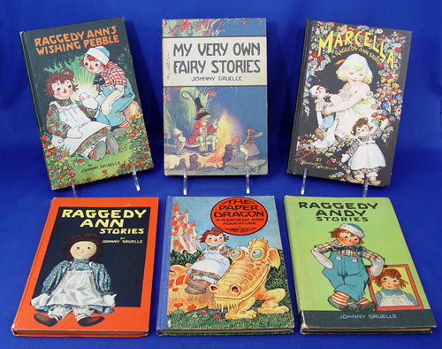 6 JOHNNY GRUELLE RAGGEDY ANN BOOKS: All are in the original boxes, published by P.F. Volland. 1) ''The Paper Dragon'', copyright 1926. 2) ''Raggedy Ann Stories'', copyright 1918, ''one hundred and fifty-first edition''. 3) ''Marcella a Raggedy Ann Story'', copyright 1929. 4) ''My Very Own Fairy Stories'', copyright 1917, forty-seventh edition 5) ''Raggedy Ann's Wishing Pebble'', copyright 1925, twenty sixth edition. 6) ''Raggedy Andy Stories'', copyright 1920, one hundred and first edition. The books are in very good condition as they have been stored in the boxes, the boxes have some expected wear. Written and illustrated by Johnny Gruelle.