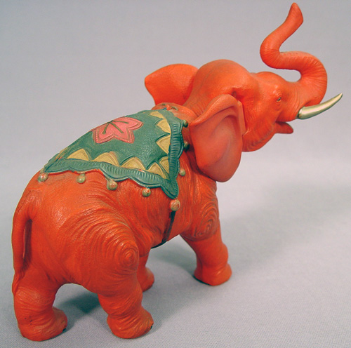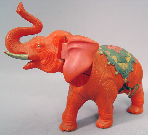 VINTAGE TOY KEY WIND CELLULOID ELEPHANT: Bright red elephant, his head moves with the turn of a key, his ears flap on hinges. 6''h. 9 1/4'' long.
