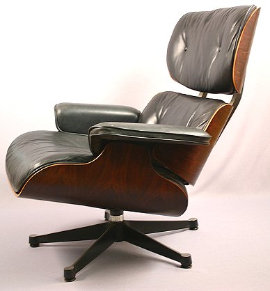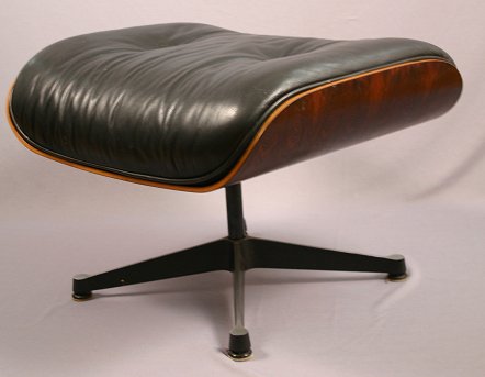 VINTAGE EAMES DESIGNED HERMAN MILLER ROSEWOOD CHAIR AND OTTOMAN: Rosewood shell with black leather. Labeled Herman Miller Vitra. The chair is 33''h. x 33''w. x 28''. The ottoman is 17''h. x 33'' x 28''. From a local estate, in very good condition.