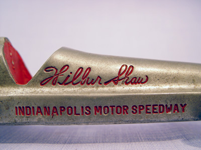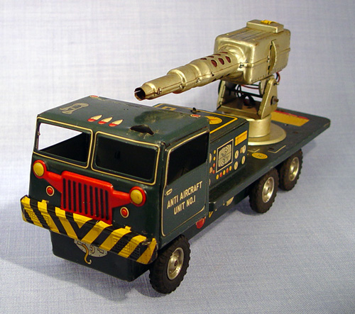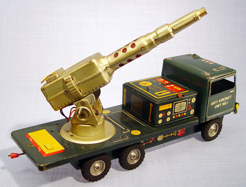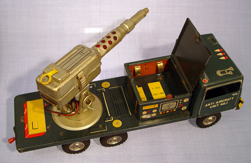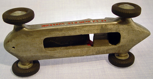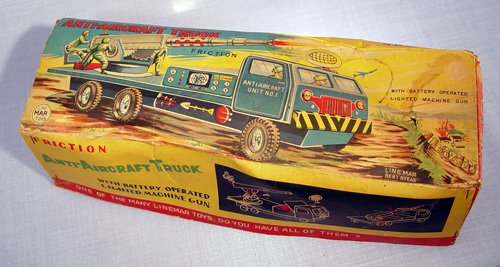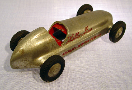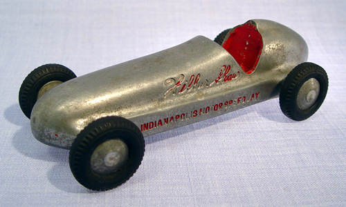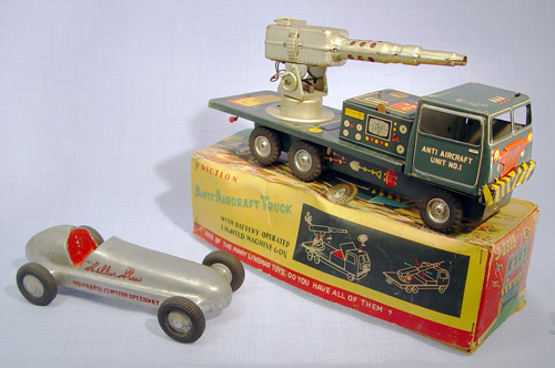 WILBUR SHAW CAST ALUMINUM INDY 500 RACE CAR: 8 1/2''l., played with condition. Sold with a Line MAR Toys Friction Anti-Aircraft Truck J-2315 in box, in played with condition.