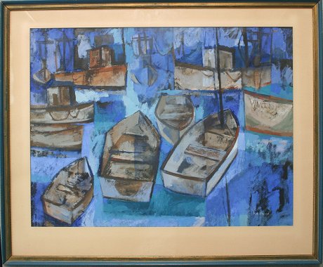 MODERNIST HARBOR PAINTING SIGNED RUTH OSGOOD: 21'' X 29'', signed, custom frame, 28'' X 35''.