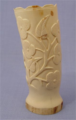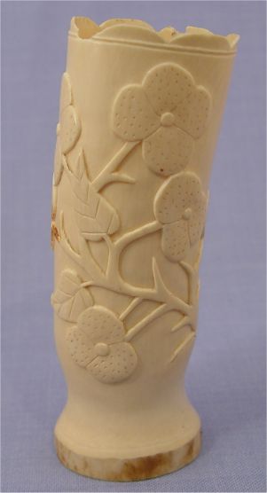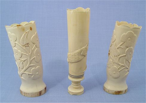 3 AFRICAN BELGIAN CONGO CARVED IVORY VASES: Each in relief carving from a tusk 1) floral design, 6 1/4''h., 2 1/2'' dia. 2) matches #1, 6 1/4''h, 2'' dia., chipped along upper rim 3) wrapped in a crocodile, 7 1/2''h., chipped along upper rim.