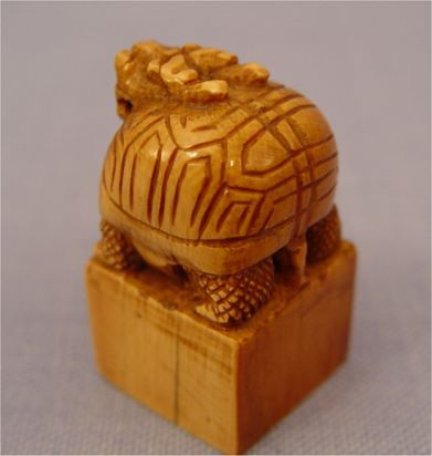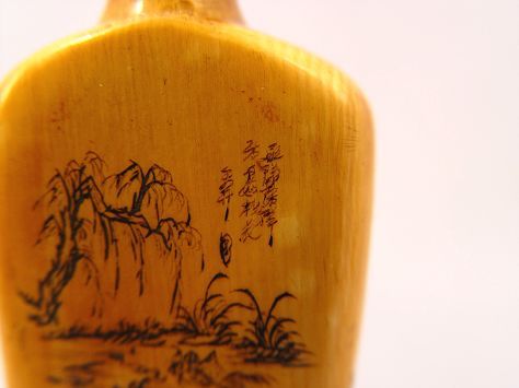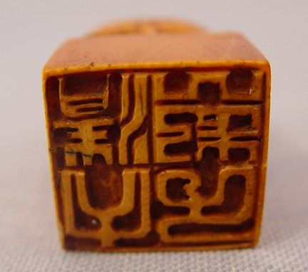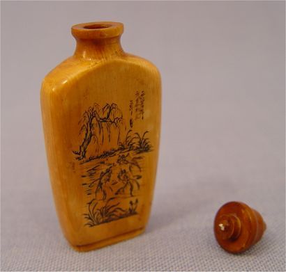CARVED IVORY SNUFF BOTTLE AND CHOP STAMP: Carved and stained, the snuff bottle is incised carved water scene on one side, relief carved figure of a man on the other. The spoon is detached from the stopper. 2 7/8''h. The chop is in the form of a tortoise. 1 3/4''.