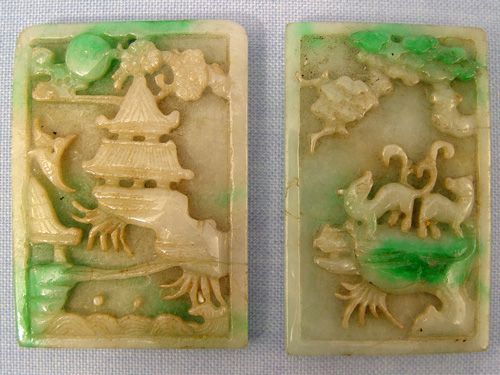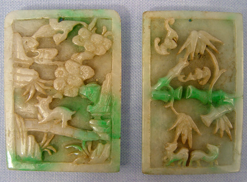 2 CHINESE CARVED JADE PLAQUES: 3 1/8'' x 2 1/4''. Each carved on front and back.