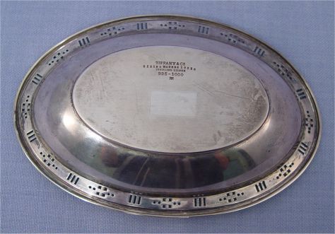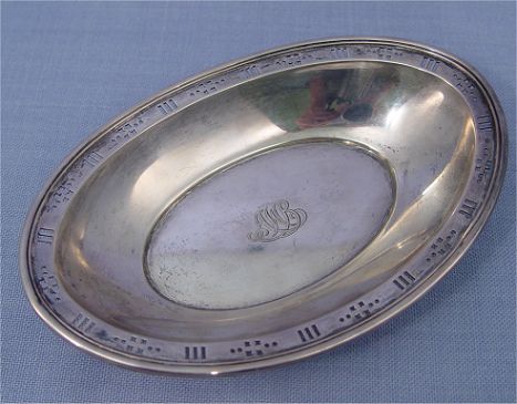 TIFFANY & CO. STERLING BOWL: Tiffany makers, 1'' h., 6 1/4'' l. Reticulated order, center monogrammed AWB. Approx. 129 grams. or 5.27 oz.