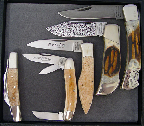 ESTATE LOT OF 5 PARKER POCKET KNIVES: To include, Parker Edwards Jacksonville FL single blade, lockback, 1985 American Blade Collection Limited Edition #1369 of 5000, burnt bone grip, 3 3/4'' blade; Parker Cut. Co. Surgical Steel, single etched blade, lockback, burnt bone grip, 3 1/4'' blade; Parker Cut. Co. Surgical Steel Japan, single blade marked Hand Made and with oriental characters, polished bone handle, 3'' blade; Parker Cut. Co. Eagle Brand Cutlery Surgical Steel, three blade, polished bone handle; and a Parker Cut. Co. Eagle Brand Cutlery Surgical Steel, four blade, polished bone handle. All appear to have never been used, sold as a lot.