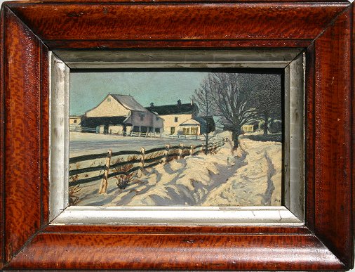 IMPRESSIONIST WINTER LANDSCAPE PAINTING: O/B, Signed Marcase, 4 3/4'' x 7 1/8'', grain painted frame with wear, 8 1/4'' x 10 3/4''.