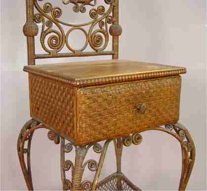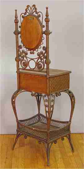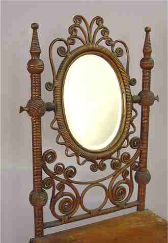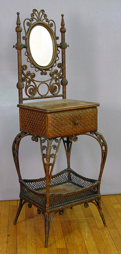 WAKEFIELD RATTAN CO WICKER DRESSING TABLE CA 1880-1890: One drawer with an oval beveled mirror above and galleried tier below, cabriole legs. Remnants of a paper label. 53''h. s 15 1/2'' x 15 1/2'' overall.