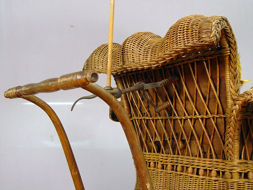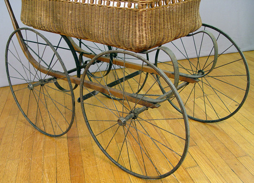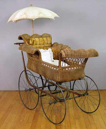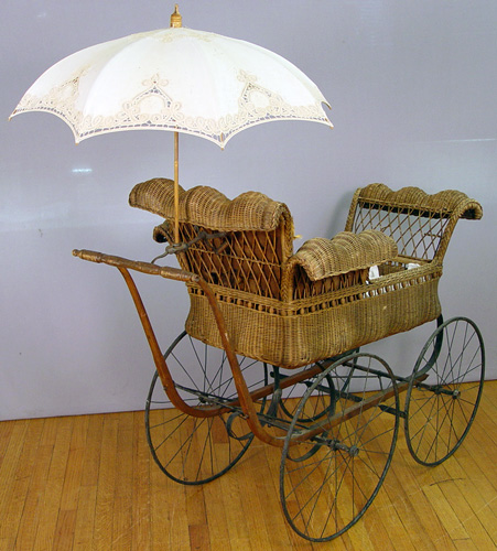 ''THE HEYWOOD'' VICTORIAN WICKER BABY BUGGY: Natural finish with original horsehair stuffing and sun shading umbrella, rolled arm rests. Please call for condition. Some rubber still on iron wheels. 40''h. x 53'' x 21''.