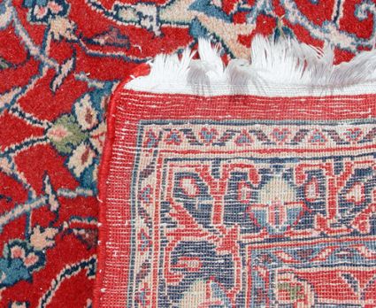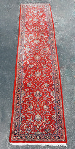 HAND TIED SAROUK CARPET RUNNER: Approx. 14'8'' long x 2'10''. Red ground.