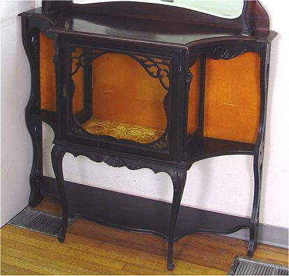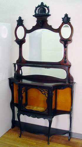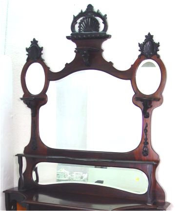 19TH C EDWARDIAN MAHOGANY ETAGERE: Featuring four beveled mirrors, applied carving, glass front display section, and open shelving. 92''h. x 48'' x16''. Est. $1500/1800**