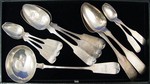 LOT OF STERLING AND COIN SILVER SPOONS: Eleven spoons to include, four sterling Gorham fiddle back serving spoons date marked 1870; two sterling teaspoons one Durgin the other marked James H. Fairbanks; teaspoon marked D.P. Arner Richmond KY; and one teaspoon with no mark found; one serving spoon marked E & D. Kinsey - Edward & David Kinsey Cincinnati Ohio active 1844-1861; and two serving spoons by Francis A. Bunnell Syracuse, NY active ca 1850's. Sold as a lot. | 140 |