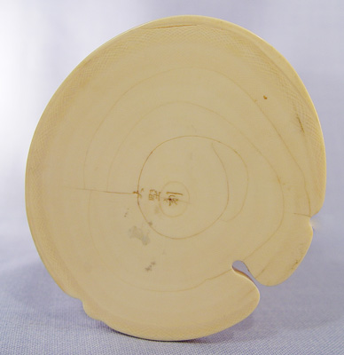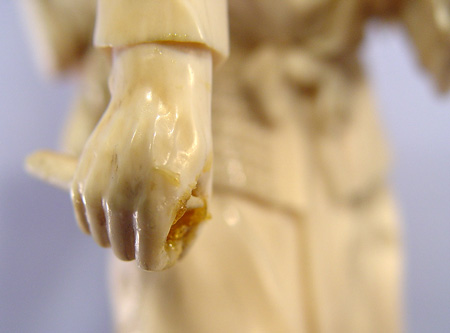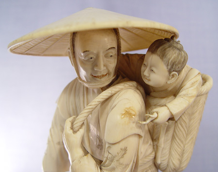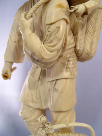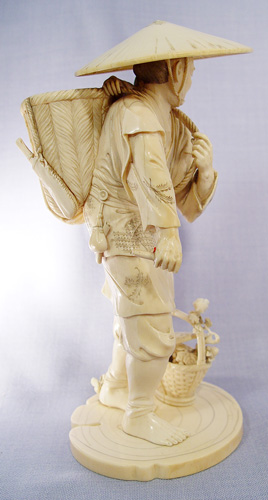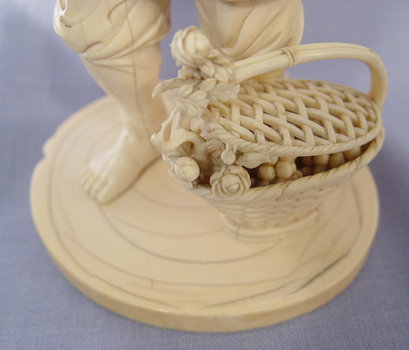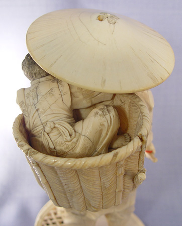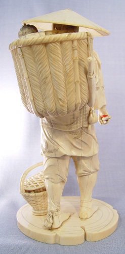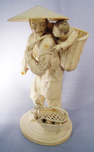 JAPANESE CARVED IVORY FIGURE: Man with child in basket on his back and basket of fruit and flowers at his feet. Fine detail, appears to have had something in his hand. 9 1/2''h., 4 1/2'' dia. at base.