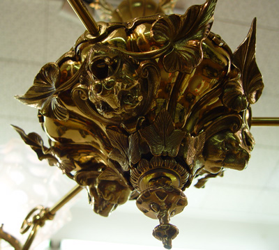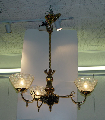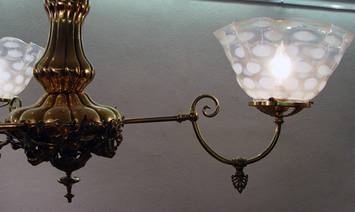 3 LIGHT BRASS CHANDELIER WITH COIN DOT OPALESCENT GLASS SHADES: Converted to electric, note the masqueron heads circling the base. Hangs 43'', 34'' span.