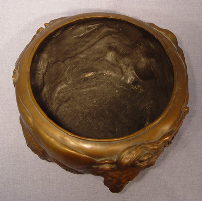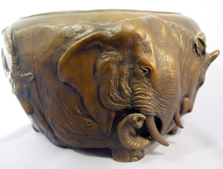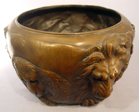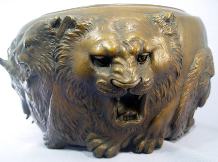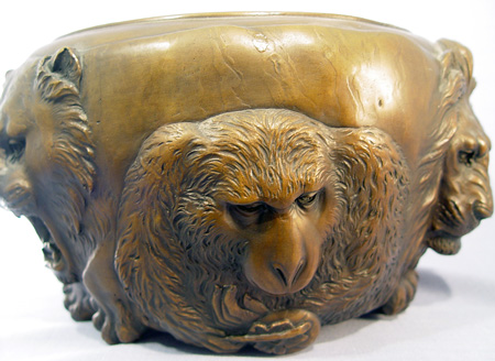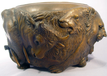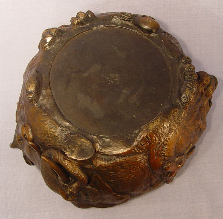 JAPANESE BRONZE JARDINIERE: Extraordinarily heavy (20+ lbs) featuring highly detailed castings of animal faces- lion, gorilla, stag, elephant, water buffalo, lion, and bear. Signed with impressed characters. 6 1/2''h. 11'' dia. overall.