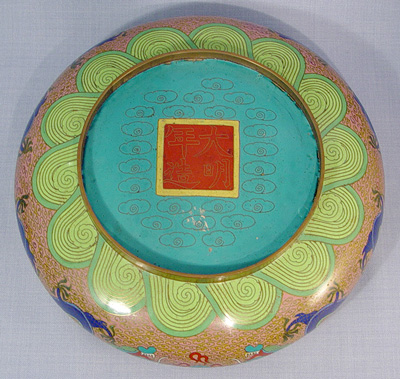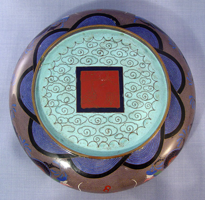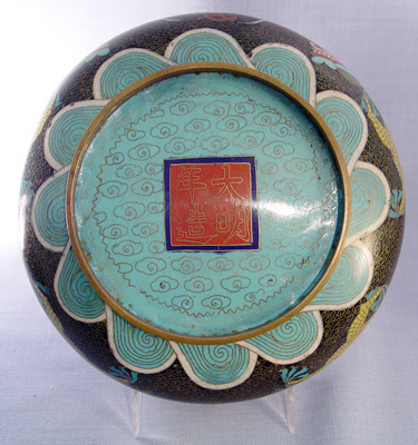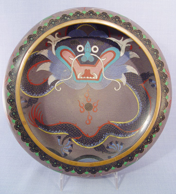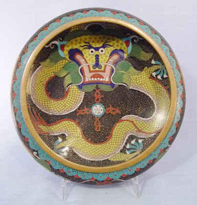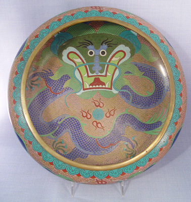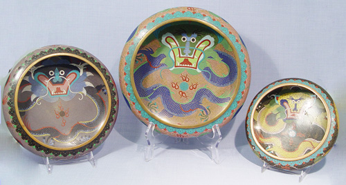3 GRADUATED CLOISONNE DRAGON BOWLS: Multi colored cloisonne on brass in a dragon motif. Each signed center bottom. Approx. sizes are 8 1/2'', 10'' and 12'' dia. Sold with two adjustable metal stands.